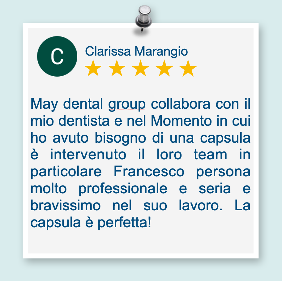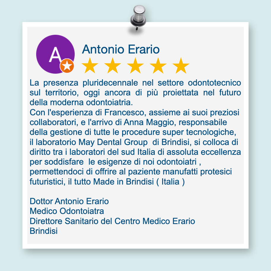 La May Dental Group srls di Maggio Annamaria, sintetizza tradizione ed innovazione con obiettivi condivisi, pronta a soddisfare le molteplici richieste dei clinici odontoiatri. Un’unica struttura comprende le aree di odontotecnica tradizionale e digitale, insieme a un centro direzionale dedicato a controllo di qualità, gestione amministrativa e certificazione dei dispositivi medici. Offre consulenza e supporto agli studi odontoiatrici, sostenuta da macchinari all’avanguardia e certificazioni di riconoscimento da importanti aziende, confermando la May Dental Group srls come laboratorio di qualità e partner autorizzato alla realizzazione di dispositivi protocollati. L’azienda si distingue anche per l’utilizzo di materie prime attentamente selezionate per garantire un processo produttivo totalmente tracciabile.